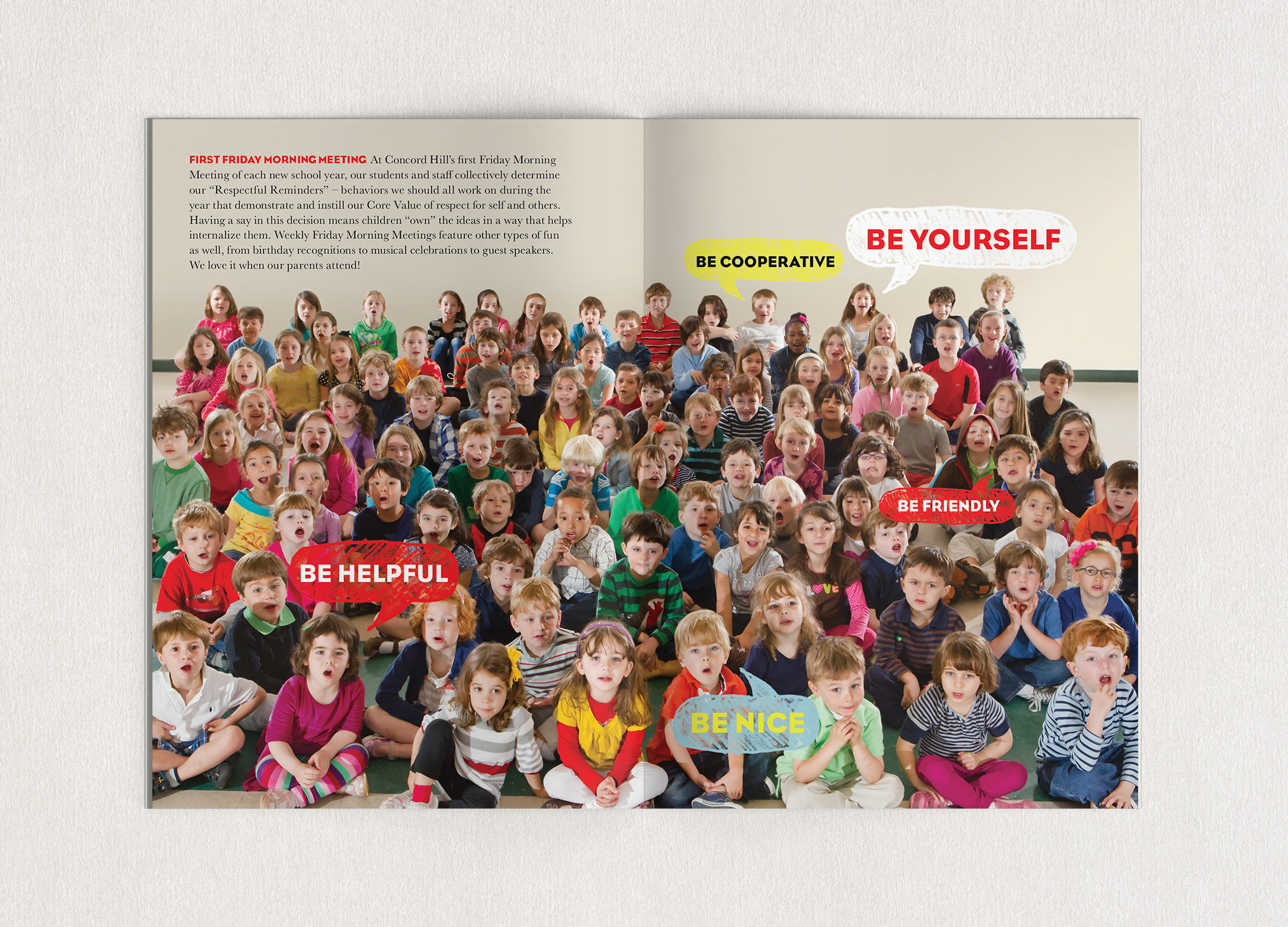 An oversized, two-color main book was created to house curriculum details and enrollment forms, while a smaller, full-color lookbook showcases the day-to-day experience for Concord Hill students.