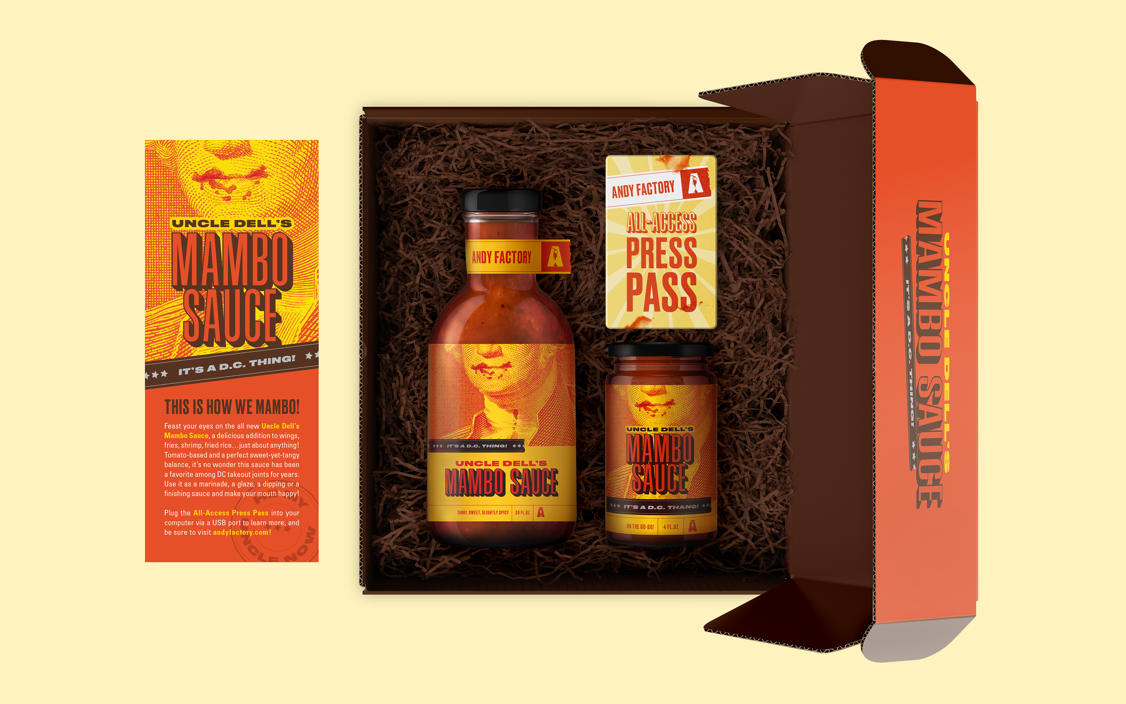 Identity and packaging suite for Andy Factory, a budding sauce company who relaunched their flagship product, “Uncle Dell’s Mambo Sauce”, in late 2019. Founded by two teenage brothers, the objective was to create a brand experience that captured their distinctly youthful vibe, honored and elevated mambo sauce’s origins in Washington D.C. carryout restaurants, and commanded attention on store shelves next to more widely familiar condiments.